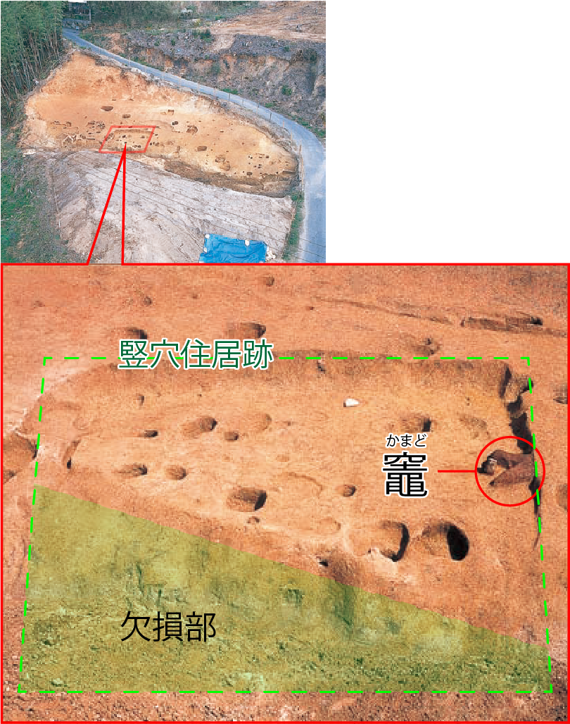 この一帯では縄文時代~平安時代末・鎌倉時代初頭にかけての遺構が発見されており、主な遺構として、落とし穴・竪穴住居・掘立柱建物・須恵器の窯に関連する遺構・木棺墓があります。