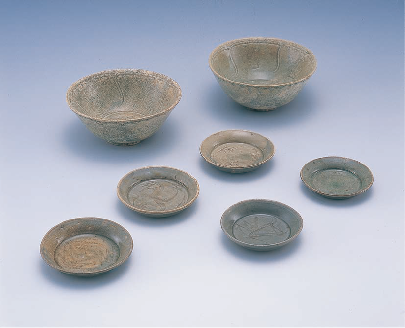 写真3は平安時代末から鎌倉時代初頭頃(約800年前)の木棺墓から出土した青磁です。椀が2点・皿が5点あります。椀の内側には花あるいは雲を表現した文様とキノコ状の文様を描いており、皿の内側にはヘラによる文様と櫛状の工具によるジグザグ状の文様を施しています。椀は龍泉窯(りゅうせんよう)系青磁、皿は同案窯系青磁と呼ばれるもので、両方とも12世紀後半頃に中国(当時は宋)の南部で焼かれたものです。当時、青磁や白磁といった陶磁器はすべて海外(主に中国)からの輸入品でした。そのため大変高価で貴重であったと考えられています。
